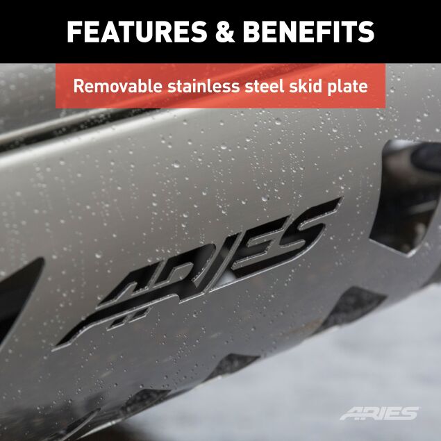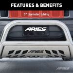 The ARIES 3" bull bar is made for those who face the uncertain road without fear. It features a vehicle-specific design for a custom fit, a pre-drilled crossbar for mounting LED lights and a durable construction to complement the look of your truck or SUV. This model is made with 304 stainless steel for maximum rust resistance and has a polished finish for a bright, clean accent.
