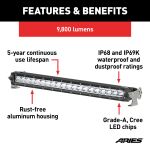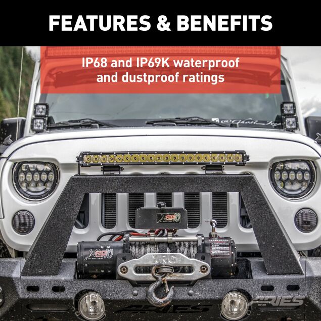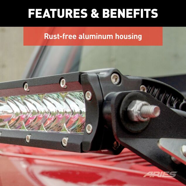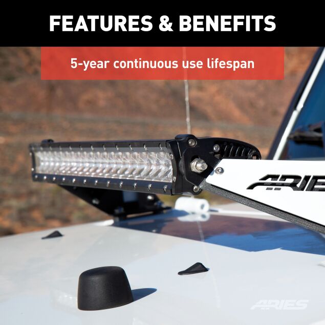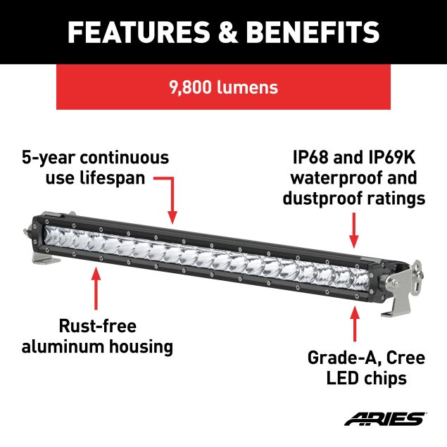ARIES LED lights are made to shine bright, last long and take a beating. Each light boasts grade-A LED chips, an IP68-standard breather, waterproof aluminum construction, a 50,000+ hour lifespan and a pedigree of thorough testing and certifications. This 20" light bar is designed to be mounted on a bull bar, grille guard, headache rack or other accessory. It offers a 9,800-lumen combo beam pattern and comes with a waterproof wiring harness and stainless steel hardware for easy, long-lasting installation. One LED light bar is included in the package.