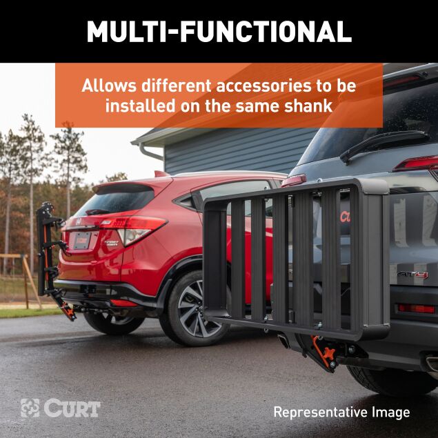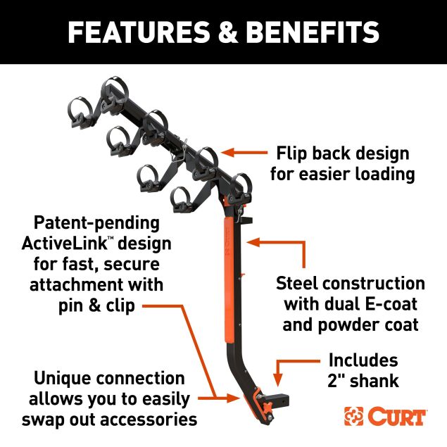 The ActiveLink Ultra bike rack is all about bringing maximum confidence and convenience to the active, outdoor lifestyle. It is built around the revolutionary ActiveLink technology from CURT, a hitch-mounted system that allows for fast, easy, secure attachment of hitch accessories like never before. This model transports up to four bikes at once and is rated to hold up 180 lbs. It can also be used in a two-bike configuration. Unlike a traditional hitch connection that requires you to get down on your hands and knees, and feel around grimy components to line everything up, this bike rack features the ActiveLink shank. Simply install the shank one time in your receiver, and you can swap out accessories in a flash. The shank features a bottom bolt that provides a resting point for the accessory attachment, perfectly lining up the hitch pin holes for an effortless connection. Drop in the bike rack whenever you need it, or swap it out in a snap. It’s that easy.